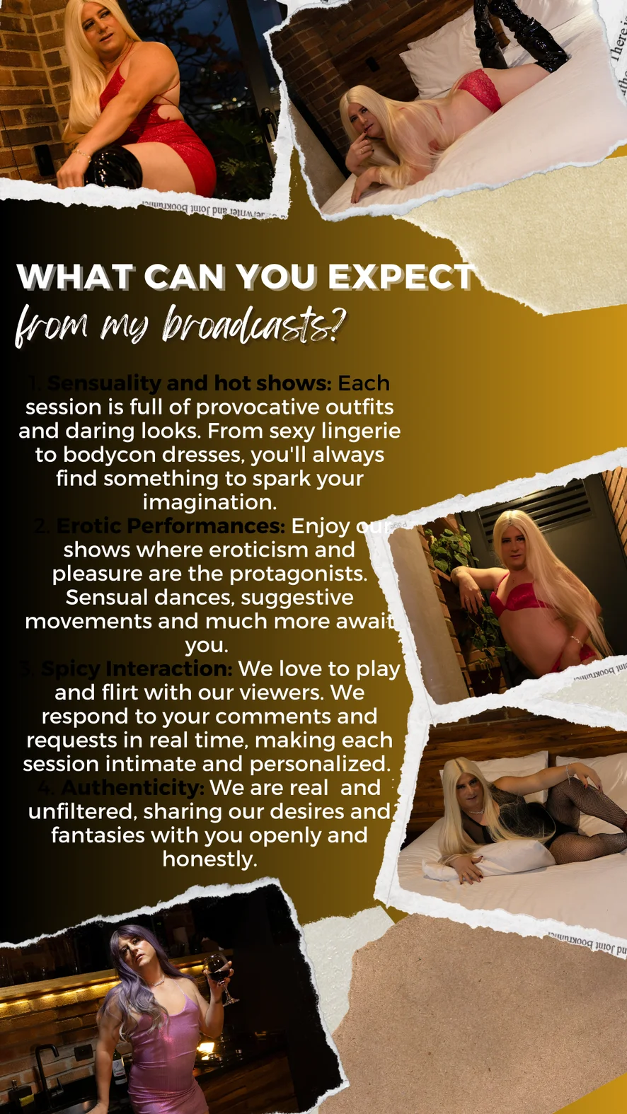 Doggy style, Erotisk dans, Spanking, Skittensnakk, Dildo eller vibrator, Stripping, Fotfetish, Precum, Gagging, Footjob, Oljeshow, Hæler, Twerk, Toppløs, Ahegao, Cumshot, Fingring, Facesitting, Deepthroat, Ydmykelse, Cum Play, Rollespill, Sexleketøy, Brystvorteleker, Onani, Anal, Ræv til munn, Ejakulering, Onaneringsinstruksjon, Analleketøy, Blowjob, Orgasme, SPH, Hardcore, Svelging